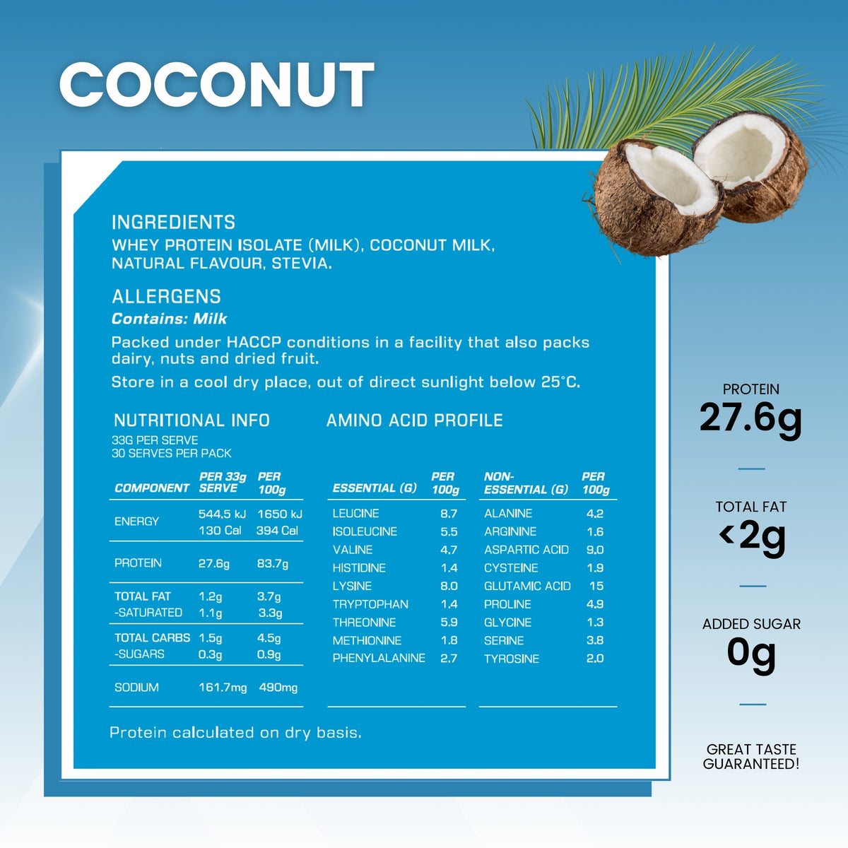 Whey Protein Isolate (Milk), Coconut Milk, Natural Flavour, Stevia