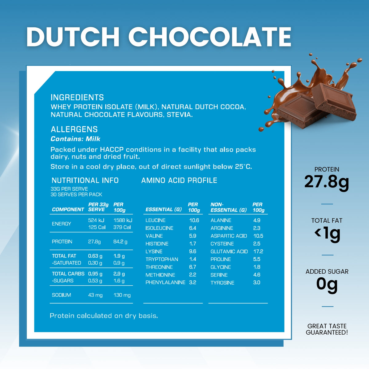Whey Protein Isolate (MILK), Natural Dutch Cocoa, Natural Chocolate Flavours, Organic Stevia.