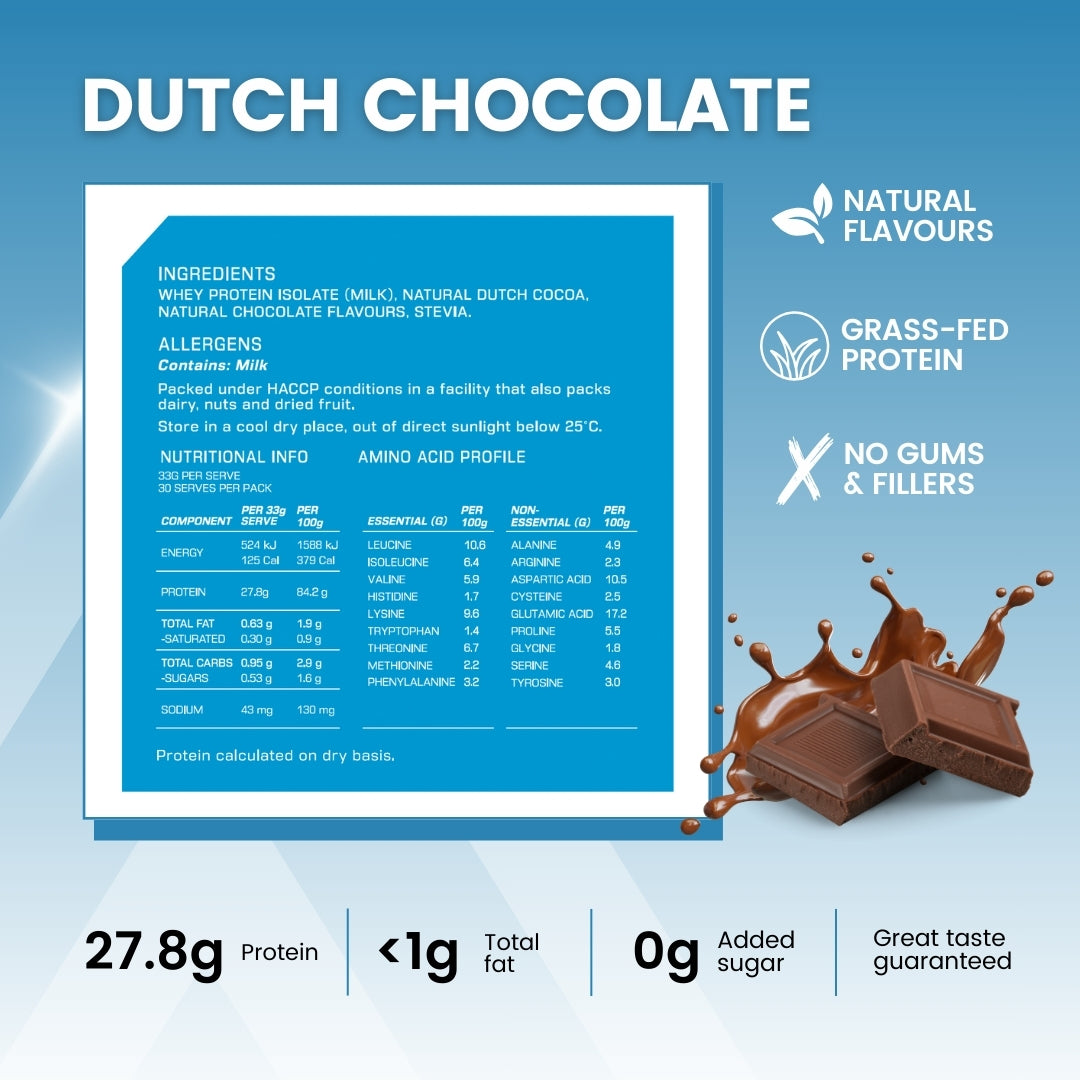 Whey Protein Isolate (MILK), Natural Dutch Cocoa, Natural Chocolate Flavours, Organic Stevia.